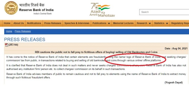 రిజర్వ్ బ్యాంక్ ఆఫ్ ఇండియా(RBI) ఆగష్టు 24, 2021న, ఈ విధంగా కొనసాగుతున్న మోసపూరిత కార్యకలాపాలలో భాగంగా వివిధ ఆన్లైన్ లేదా ఆఫ్లైన్ ప్లాట్ఫారమ్ల ద్వారా పాత నోట్లు మరియు నాణేలను కొనుగోలు చేసే లేదా విక్రయించే బోగస్ ఆఫర్లకు వ్యతిరేకంగా ప్రజలను హెచ్చరించింది.