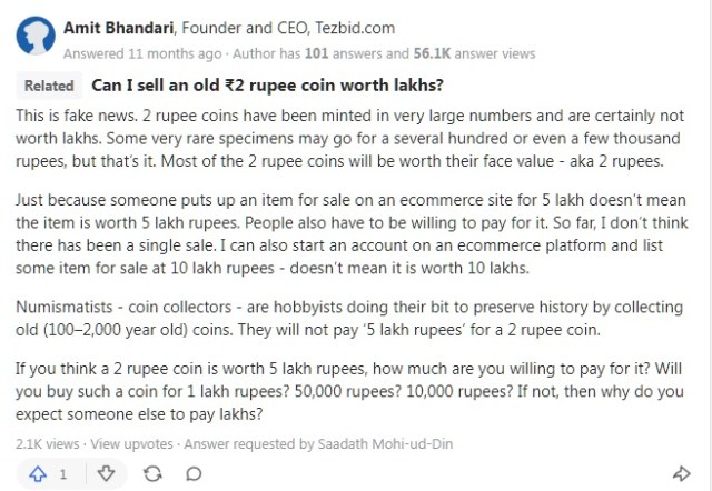 నిర్ధారణ: Quikr లేదా Tezbid.com వంటి ఆన్లైన్ ఇ-కామర్స్ వెబ్సైట్లలో 2 నాణెం గరిష్టంగా రూ.500కి విక్రయిస్తుంది, అంతే కాని లక్షల్లో కాదు.మరియు బ్యాంక్ ఖాతా నుండి డబ్బును దోచుకొడానికి ఆన్లైన్ మోసంలో భాగం కావచ్చు. కాబట్టి ఈ Claim/వాదన తప్పు.నిజం లేదు.