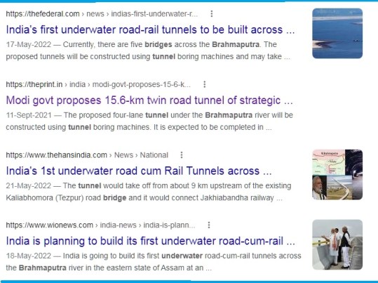 బ్రహ్మపుత్ర నది దిగువన ఉన్న నీటి అడుగున లింక్‌కు(underwater link ) సంబంధించిన వార్తల కోసం వెతుకుతున్నప్పుడు, రైల్వే మంత్రిత్వ శాఖ, రోడ్డు రవాణా మంత్రిత్వ శాఖ మరియు బోర్డర్ రోడ్స్ ఆర్గనైజేషన్ (BRO) దేశంలోనే నీటి అడుగున మొట్టమొదటి రోడ్-కమ్-రైల్ సొరంగాలను నిర్మించాలని యోచిస్తున్నట్లు పలు వార్తా నివేదికలు వెలువడ్డాయి. బ్రహ్మపుత్ర నది అస్సాం మరియు అరుణాచల్ ప్రదేశ్‌లను కలుపుతుంది, దీని నిర్మాణానికి వ్యయం ₹7,000 కోట్లు అని అంచనా.