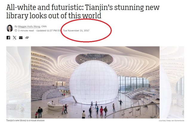 గతంలో ఇదే విధమైన వాదనని తప్పని నిరూపించినందున,ఈ వాదనని కూడా Digiteye India team వారు పరిశీలించారు. గూగుల్ రివర్స్ ఇమేజ్ సెర్చ్లో తెలుపు భవనం యొక్క చిత్రంని ఉపయోగించి సెర్చ్ చేసినప్పుడు, అమెరికాలో కాకుండా చైనాలో ఉన్న అసలు భవనాన్ని కనుగొన్నాము. ఈ భవనం చైనాలోని టియాంజిన్లోని బిన్హై లైబ్రరీకి చెందినది. క్రింద చూపిన విధంగా అనేక వార్తా నివేదికలు (CNN) కూడా ఇదే సమాచారాన్ని వెల్లడిస్తున్నాయి:
