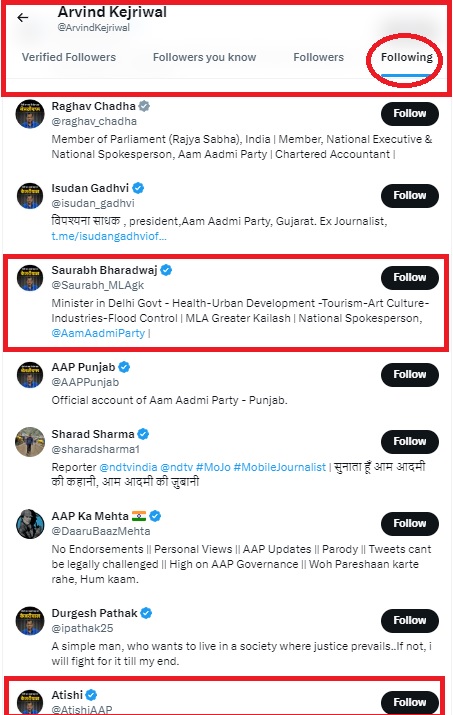 కానీ కేజ్రీవాల్ ట్విట్టర్ ఖాతాలో మరింత వెతకగా, అతిషి మరియు సౌరభ్‌లు ఇప్పటికీ అతని ఖాతాలో అతనిని అనుసరిస్తున్నట్లు మేము గమనించాము. కింద చూడవచ్చును.