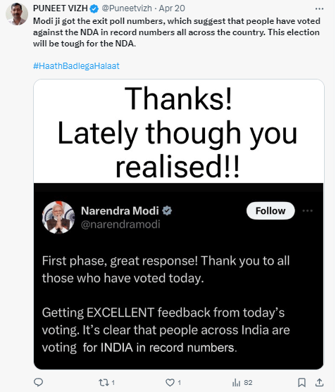 ఏప్రిల్ 19, 2024న లోక్సభ ఎన్నికలకు మొదటి దశ పోలింగ్ జరిగిన తర్వాత , రికార్డు సంఖ్యలో INDIA (కూటమి)కు ఓటు వేసినందుకు ప్రజలకు కృతజ్ఞతలు తెలుపుతున్నట్లు ప్రధానమంత్రి నరేంద్ర మోదీ పేరుతో స్క్రీన్షాట్ షేర్ చేయబడుతోంది.