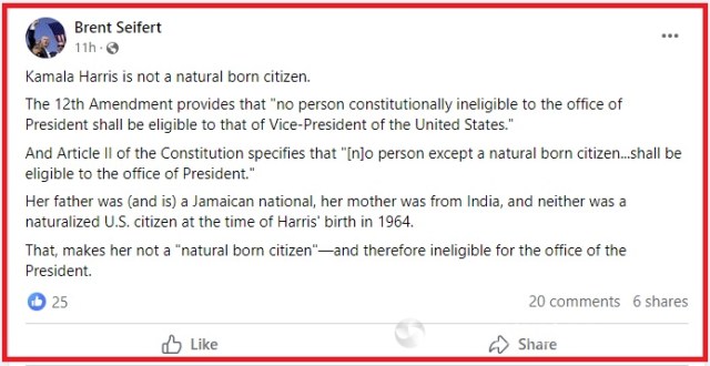జూలై 21, 2024న అధ్యక్ష రేసు నుండి వైదొలుగుతున్నట్లు US అధ్యక్షుడు జో బిడెన్ ప్రకటించిన వెంటనే సోషల్ మీడియా ఒక పోస్ట్ వైరల్ అయ్యింది.తన స్థానంలో డెమొక్రాట్ల అభ్యర్థిగా తన ఉపరాష్ట్రపతి అభ్యర్ధి అయిన కమలా హారిస్ను బలపరిచారు. కానీ కమలా హారిస్ “సహజసిద్ధంగా జన్మించిన పౌరురాలు” కానందున అమెరికా అధ్యక్ష పదవికి పోటీ చేసే అర్హత లేదని సోషల్ మీడియా పోస్ట్ పేర్కొంది.
