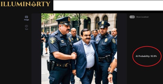 చిత్రాన్ని నిశితంగా పరిశీలించగా ఒక అధికారి ఆరు వేళ్లతో కనిపించారు, ఇది AI-రూపొందించిన చిత్రమనే అవకాశాన్ని సూచిస్తుంది.’ఇల్యూమినార్టీ’ అప్ లో క్రాస్-చెక్ చేసినప్పుడు, 92.8% ఇది AI ద్వారా రూపొందించబడిన చిత్రమనే సంభావన ఉందని తెలిపింది.